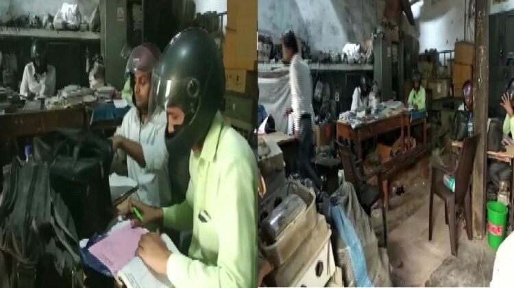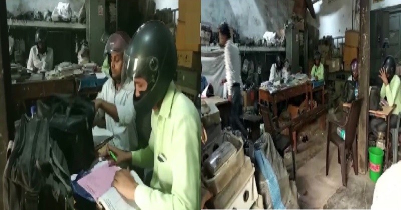 തെലങ്കാനയിലെ സർക്കാർ ഓഫീസിൽ ഹെൽമറ്റിട്ട് ജോലി ചെയ്ത് ജീവനക്കാർ. ഹെൽമറ്റും ഇട്ടുകൊണ്ടാണ് അവർ ജോലി ചെയ്യുന്നത്. പിഴയെപ്പേടിച്ചല്ല, കെട്ടിടം പൊളിഞ്ഞ് തലയിൽ വീഴാതിരിക്കാനാണ് ജീവനക്കാർ ഹെൽമറ്റും ധരിച്ച് ജോലി ചെയ്യുന്നത്.അടുത്തിടെ ഒരു ജീവനക്കാരന്റെ ദേഹത്തേക്ക് കെട്ടിടാവശിഷ്ടം വീണിരുന്നു. പരുക്കേൽക്കാതെ കഷ്ടിച്ചാണ് ഇയാൾ രക്ഷപ്പെട്ടത്കാലപ്പഴക്കം ചെന്ന കെട്ടിടത്തിലാണ് ഓഫീസ് പ്രവർത്തിക്കുന്നത്. കോൺക്രീറ്റ് കഷ്ണങ്ങളും കമ്പികളും തലയിൽ വീഴാതിരിക്കാനാണ് ഹെൽമറ്റ് ധരിച്ച് ജോലി ചെയ്യേണ്ടി വരുന്നതെന്ന് ജീവനക്കാർ പറയുന്നു. ഏകദേശം 100 വർഷത്തിലധികം പഴക്കമുള്ള കെട്ടിടത്തിന്റെ പല ഭാഗങ്ങളും അടർന്നുവീണുകൊണ്ടിരിക്കുകയാണ്. അടുത്തിടെ പെയ്ത ശക്തമായ മഴയും പ്രളയവുമെല്ലാം കെട്ടിടത്തിന്റെ അവസ്ഥ കൂടുതൽ മോശമാക്കി.മഴക്കാലം തുടങ്ങിയത് മുതൽ ഹെൽമറ്റ് ധരിച്ചാണ് ഞങ്ങൾ ഓഫീസിലെ ജോലികൾ ചെയ്യുന്നത്. പലതവണ ഉന്നത അധികാരികളുടെ ശ്രദ്ധയിൽപ്പെടുത്തിയെങ്കിലും ഒന്നും നടന്നില്ല. ഇത്രയും ഗുരുതരമായ പ്രശ്നം എത്രയും വേഗം പരിഹരിക്കണമെന്ന് മേലധികാരികളോട് അഭ്യർത്ഥിക്കുന്നു. എപ്പോഴാണ് മേൽക്കൂരയുടെ ഒരു ഭാഗം ഞങ്ങളുടെ മേൽ പതിക്കുന്നതെന്ന് അറിയാതെ പേടിച്ച് ജീവൻ കൈയിൽ പിടിച്ചാണ് ഇവിടെ ജോലി ചെയ്യുന്നത്.- ജീവനക്കാരിലൊരാൾ പറഞ്ഞു.